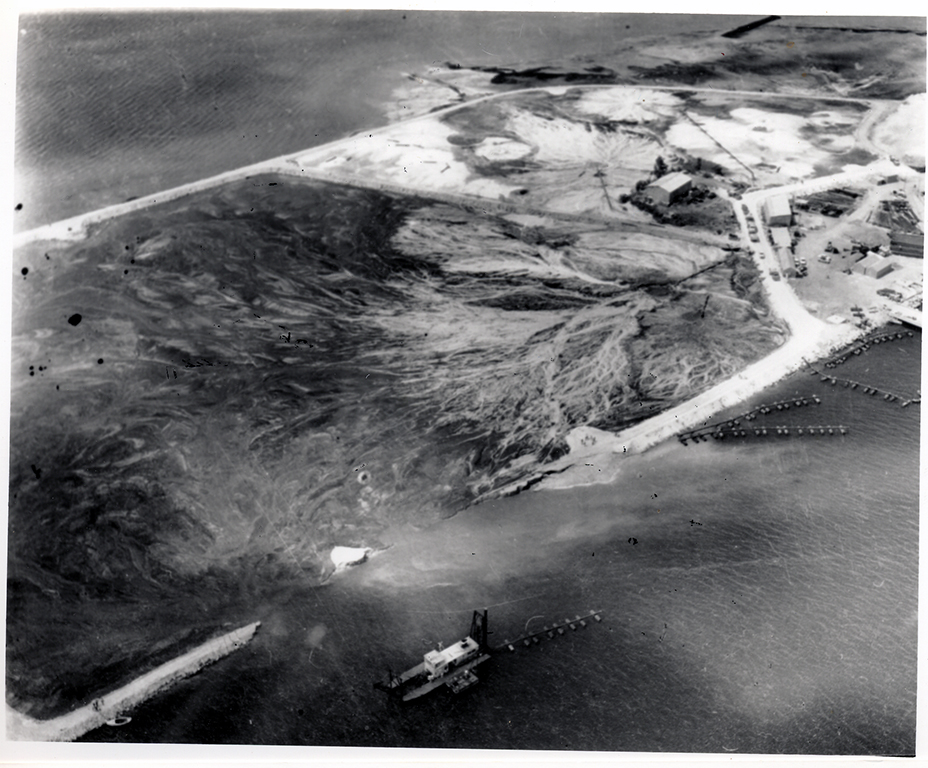 Vue aérienne oblique des premiers travaux d'endiguement et de poldérisation de Jarry en 1967