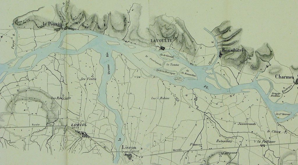 Original title (in French): Carte topographique du cours du Rhône de Lyon à la Mer. English title: Topographical map of the Rhône river from Lyon to the sea.