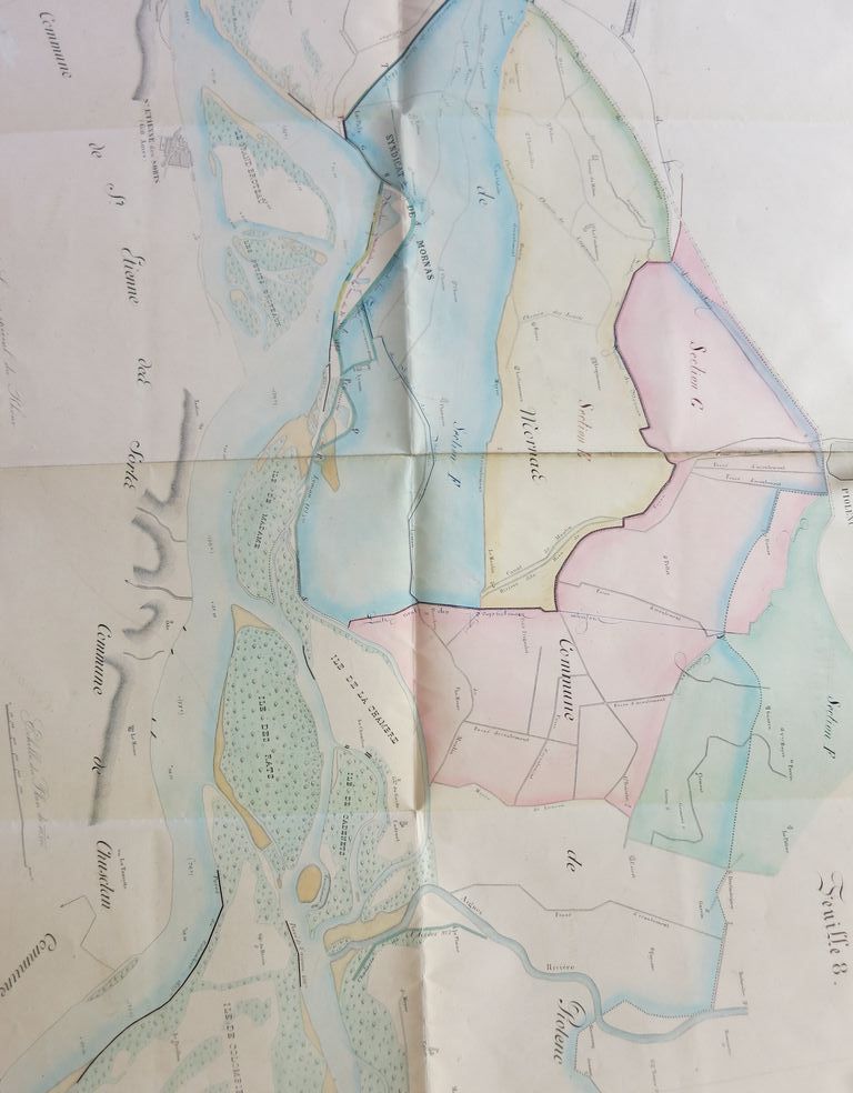 Original title (in French): Défense du bourg de Mornas contre les inondations du Rhône. Plan général avec indication des sections et parties de sections du cadastre comprises dans le périmètre intéressé aux travaux projetés. English title: Defence of Mornas against the Rhône river floods. General plan indicating land register sections and sub-sections included in the perimeter concerned by the projected works.