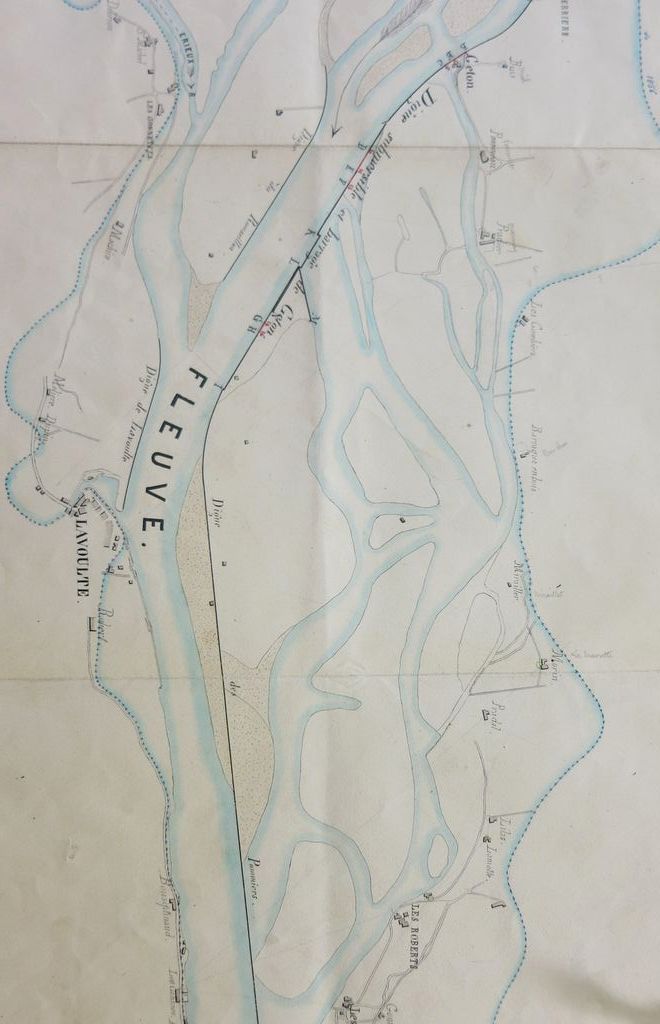 Original title (in French): Inondation du mois de mai 1856. Réparation des avaries des digues de Fraysse et de Géton. English title: Flood of May 1856. Repair of damage to the Fraysse and Géton dykes.