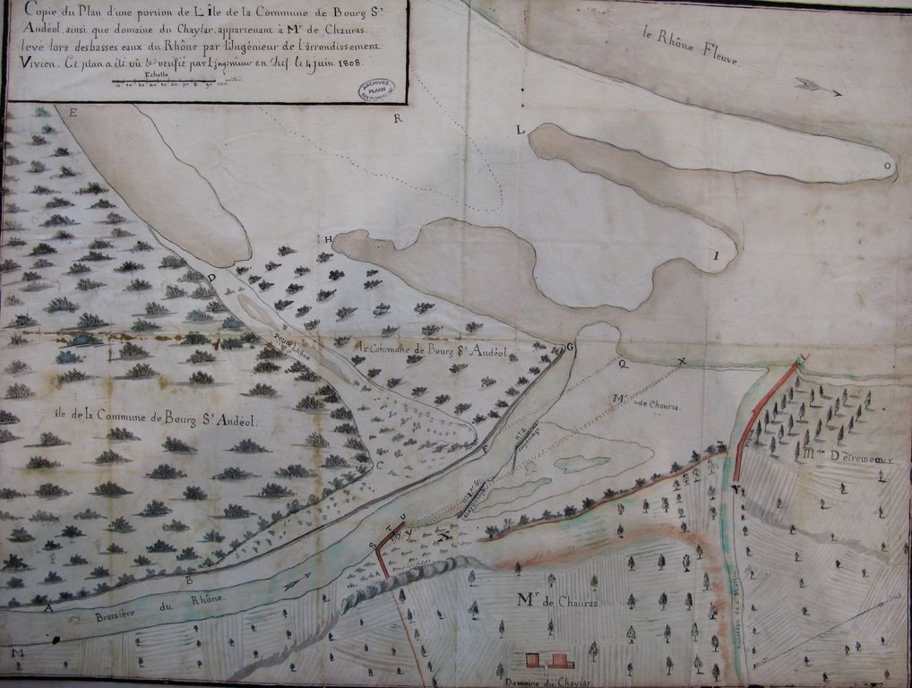 Original title (in French): Copie du plan d'une portion de l'île de la commune de Bourg-St-Andéol ainsi que domaine du Chaylar, appartennant à Monsieur de Chauras, levé lors des basses eaux du Rhône. English title: Copy of the plan of a portion of the island in the town of Bourg-St-Andéol, as well as the Chaylar estate, belonging to Mr. De Chauras, surveyed at low-flow.