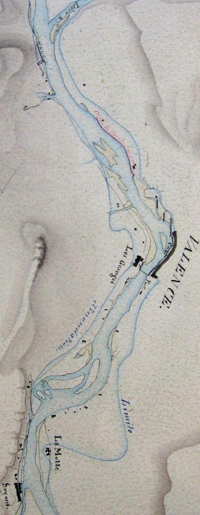 Original title (in French): Plan du cours du Rhône depuis le territoire de Montfaucon jusqu'à celui de St-Etienne-des-Sorts. English title: Map of the Rhône river from Montfaucon to St-Etienne-des-Sorts.