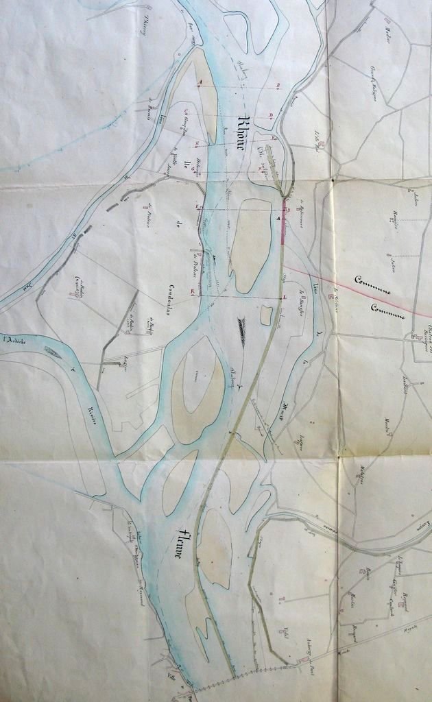 Original title (in French): Plan du cours du Rhône entre les rochers du banc rouge et le Pont-St-Esprit. English title: Map of the Rhône river between the Banc Rouge rocks and Pont-St-Esprit.