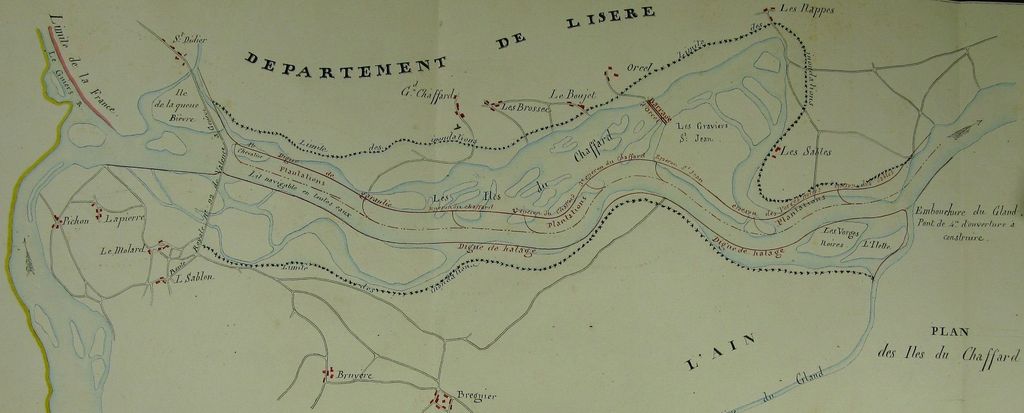Original title (in French): Application particulière pour les Iles du Chaffard depuis le pont suspendu de Cordon jusqu'au torrent du Glandieu. English title: Special application for the Chaffard islands from the Cordon suspension bridge to the Glandieu torrent.