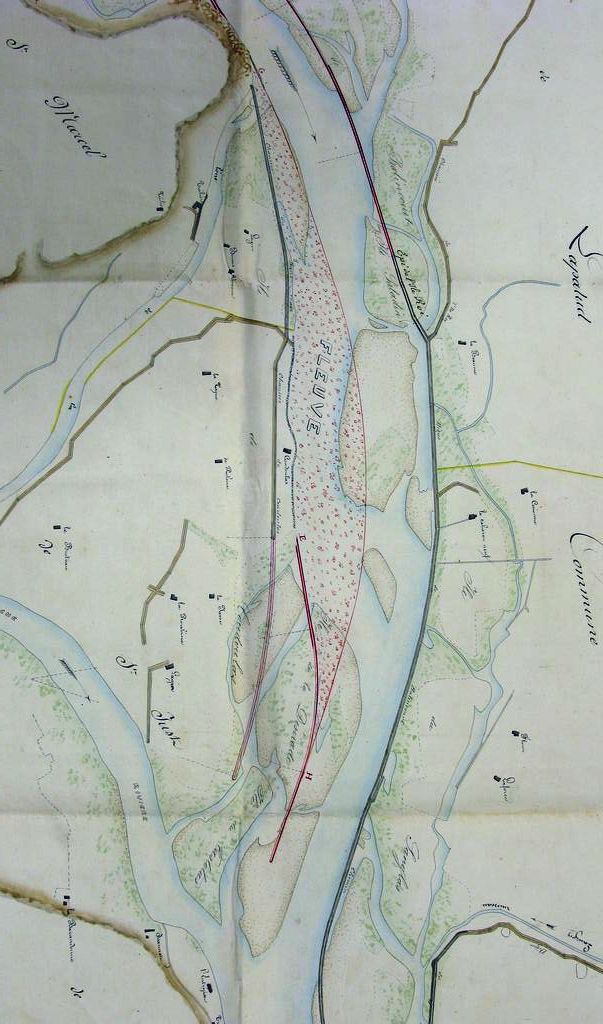 Original title (in French): Plan général des travaux à exécuter pour l'amélioration de la navigation et la défense des rives entre le pont de Bourg-St-Andéol et ceui de Pont-St-Esprit. English title: General plan of the works to be carried out for navigation improvement and bank defence between the bridge of Bourg-St-Andéol and Pont-St-Esprit.