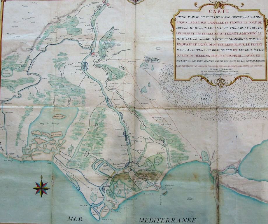 Original title (in French): Carte d'une partie du cours du Rosne depuis Beaucaire jusqu'à la mer sur laquelle se trouve le port de Bouc, le Martigue, le canal de Villars et toutes les isles et les terres appartenant à Monseigneur le Maréchal Duc de Villars (...). English title: Map of a part of the Rhône river from Beaucaire to the sea, on which can be found the Bouc port, the Martigue, the Villars canal, and all the islands and territories belonging to Monsignor the Marshal Duke of Villars (...).