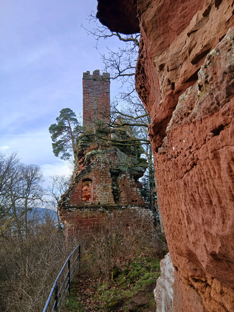 Construit à la fin du XIIIe siècle, le château de Waldeck est construit en blocs de grès rose. Les pierres à bossage lui donnent un aspect spectaculaire. Le château symbolise bien l'héritage militaire très prégnant dans cette zone frontière, avec de multiples traces d'un passé agité : forteresses, bunkers, camps, aménagements de la ligne Maginot... Le garde-corps symbolise la reconversion aménitaire et touristique de ce site, et l'un des principaux enjeux actuels sur le territoire.