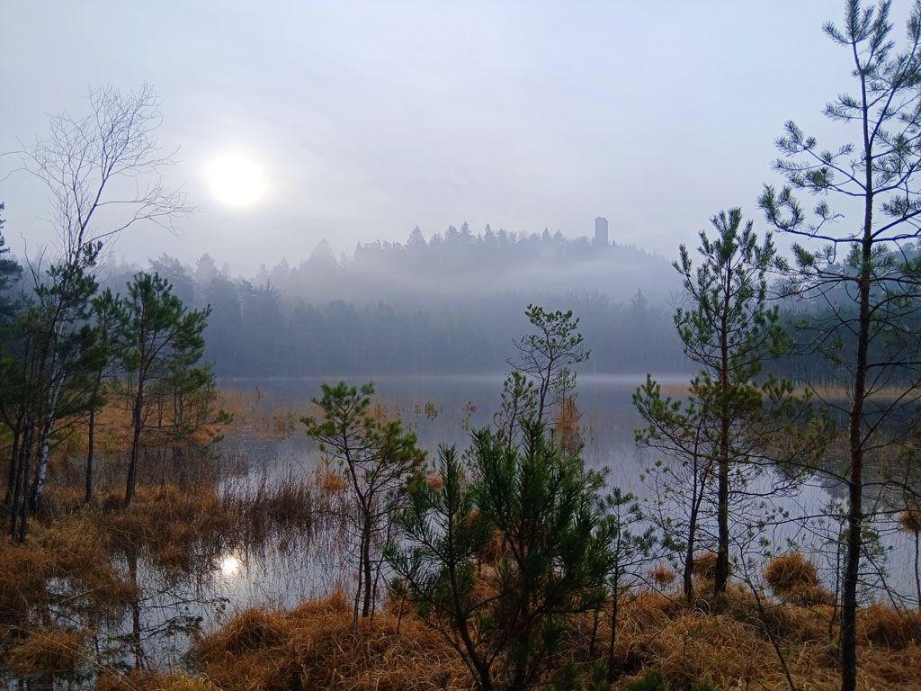 Vue de l'étang de Waldeck, avec en hauteur la silhouette du château du même nom. L'image symbolise les richesses patrimoniales du Pays de Bitche et des Vosges du Nord : patrimoine naturel, patrimoine culturel.