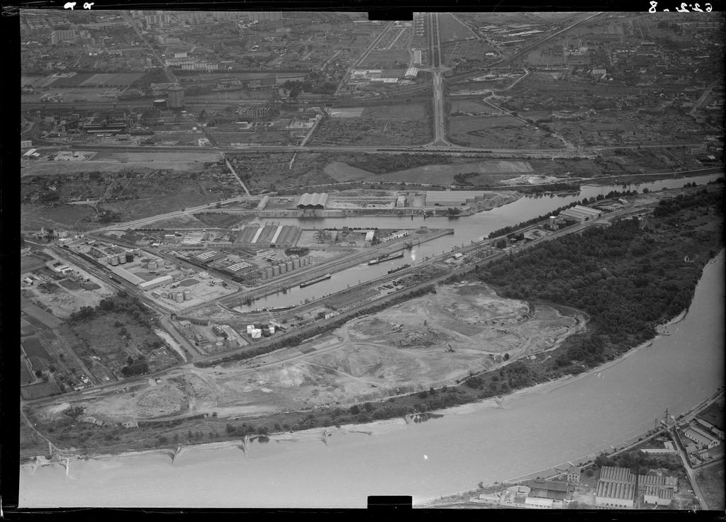 Vue aérienne du port fluvial Édouard-Herriot, inauguré en 1938. La seconde darse et la darsette seront mises en service en 1968. Des épis Girardon sont visibles en rive gauche du Rhône (vue vers l'est)