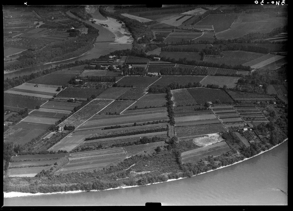 Vue aérienne de l'Ile de la Barthelasse à Avignon, enserrée par le petit Rhône et le bras de Villeneuve-lès-Avignon, avant la construction de l'aménagement en dérivation qui modifiera le site au début des années 1970 (vue vers le nord). L'Ile de la Barthelasse est en grande partie agricole. Un pont en bois est visible sur le bras de Villeneuve, vraisemblablement provisoire car absent des images aériennes verticales prises à la même époque