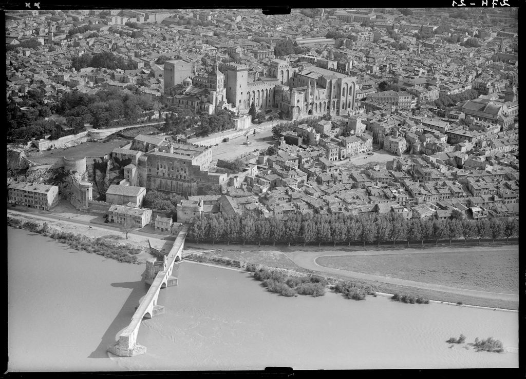 Vue aérienne du Palais des Papes d'Avignon et du pont Saint-Bénezet. La ville est implantée au bord du petit Rhône (vue vers le sud-est)