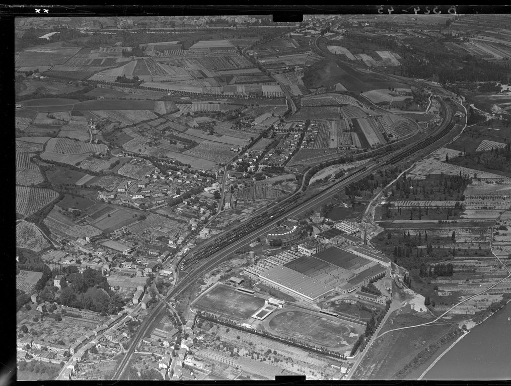 Vue aérienne de La Voulte-sur-Rhône au niveau de l'usine TASE (Textile Artificiel du Sud-Est) fondée par la famille Gillet, et implantée à La Voulte en 1916 (vue vers le nord-est). Le Rhône est visible en bas à droite de l'image, et l'Eyrieux juste en amont de sa confluence avec le Rhône est visible en haut à droite de l'image
