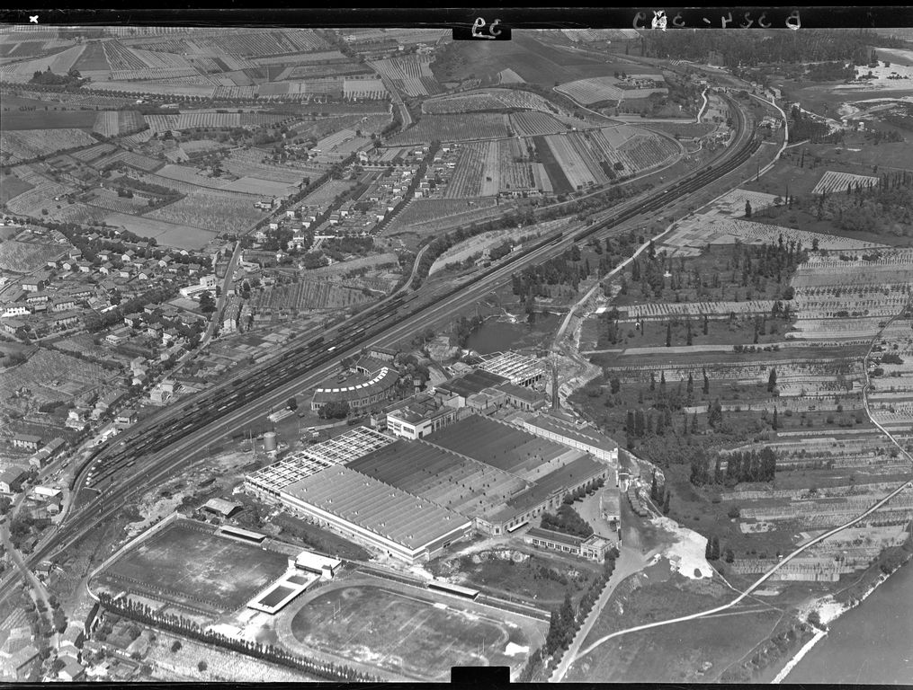 Vue aérienne de l'usine TASE (Textile Artificiel du Sud-Est) fondée par la famille Gillet, et implantée en rive droite du Rhône à La Voulte en 1916 (vue vers le nord-est)