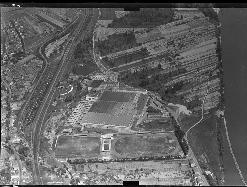 Vue aérienne de l'usine TASE (Textile Artificiel du Sud-Est) fondée par la famille Gillet, et implantée en rive droite du Rhône à La Voulte en 1916 (vue vers le nord-est). Le Rhône est visible sur la droite de l'image