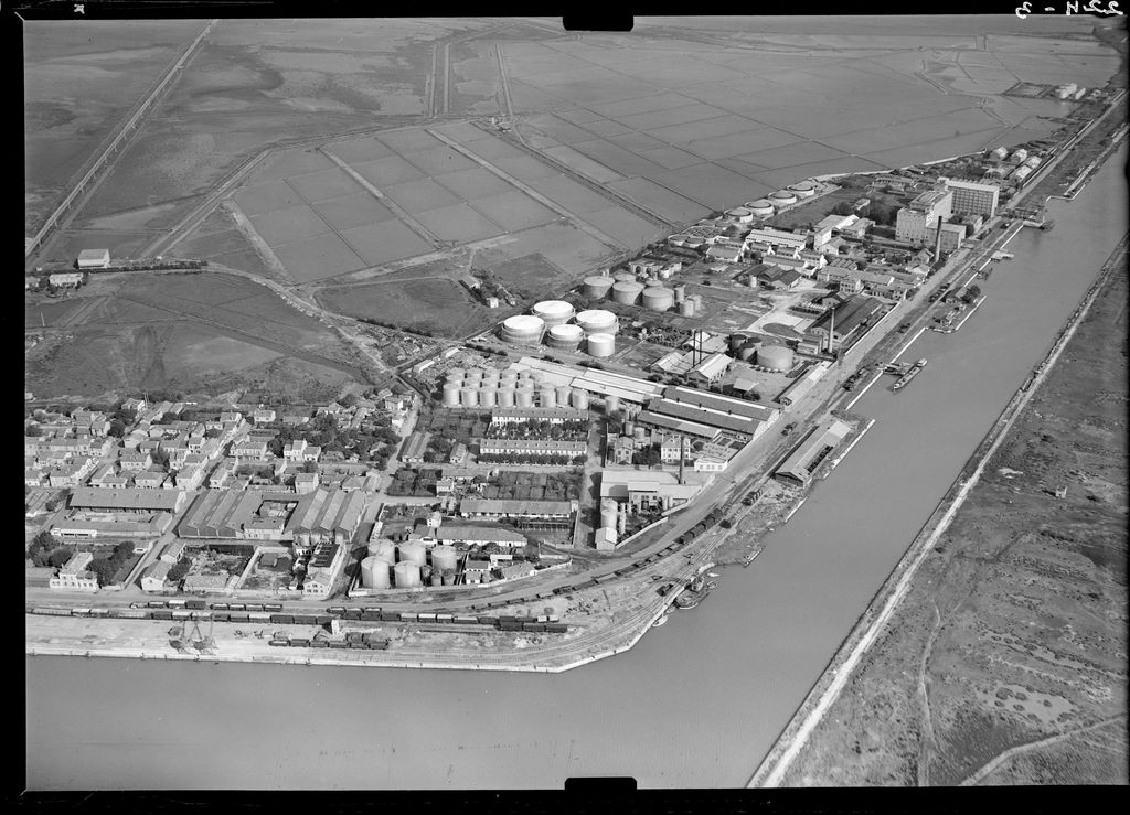 Vue aérienne du canal Saint-Louis et du bassin portuaire, ouverts en 1871-73 pour permettre aux navires d'accéder de la Méditerranée au Rhône en évitant l'embouchure (vue vers le nord-est). Le canal est bordé par une zone industrielle, dont la rizerie de Port-Saint-Louis-du-Rhône sur la droite de l'image, qui sera fermée dans les années 1980. A l'arrière-plan, le salin du Garrouyas en activité jusqu'en 1950