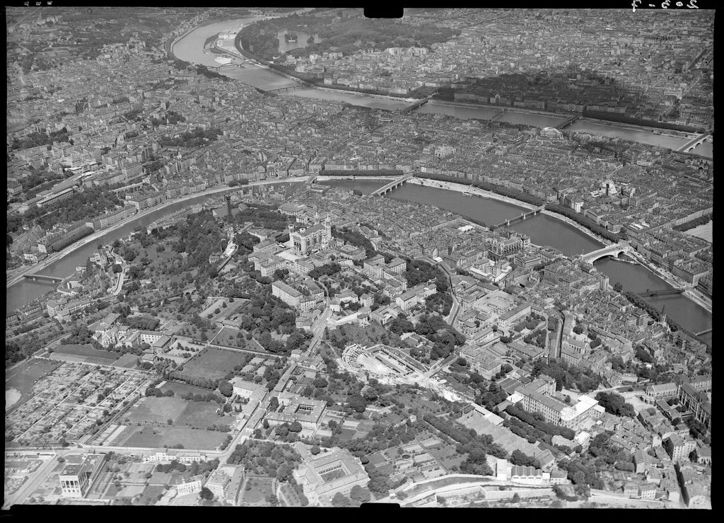 Vue aérienne de la Saône et du Rhône à Lyon, depuis la colline de Fourvière (vue vers le nord-est)