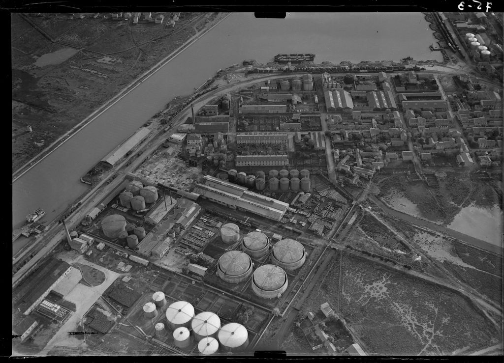 Vue aérienne du canal Saint-Louis et du bassin portuaire, ouverts en 1871-73 pour permettre aux navires d'accéder de la Méditerranée au Rhône en évitant l'embouchure (vue vers le sud-ouest). Le canal est bordé par une zone industrielle