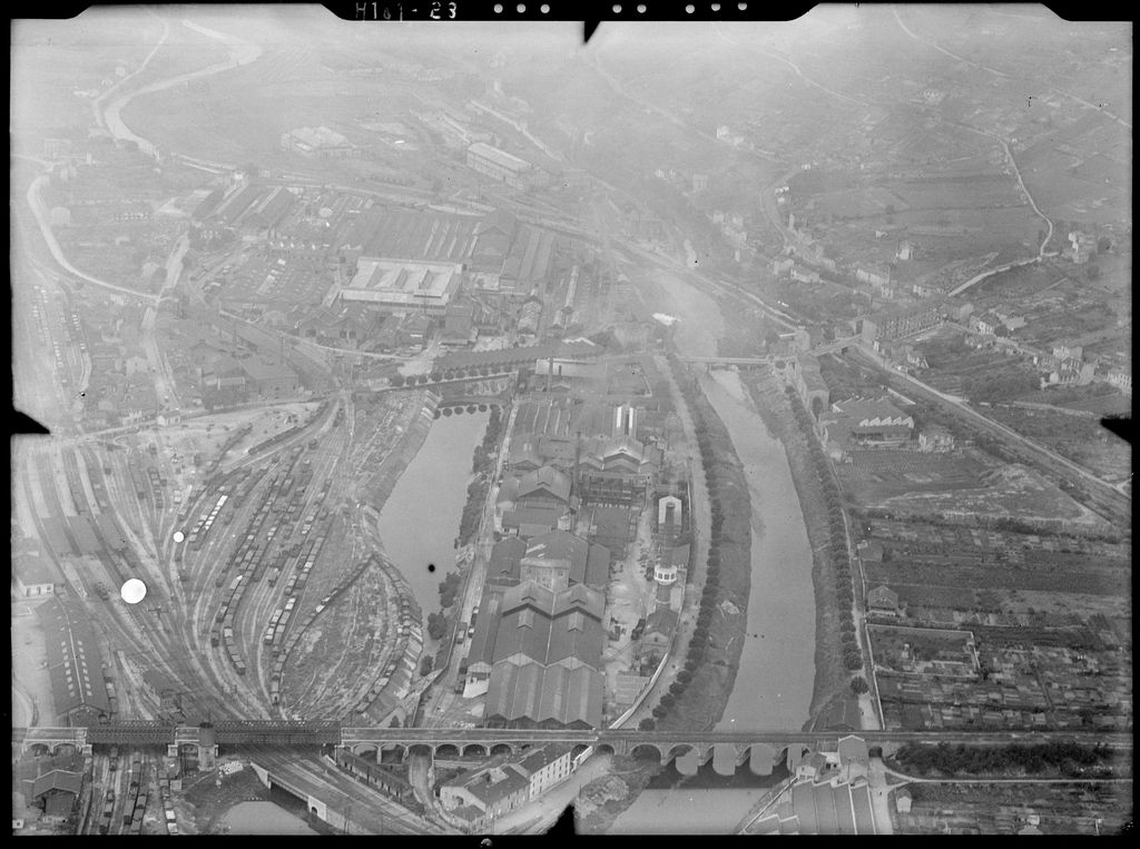 Vue aérienne du Gier à Givors, avant sa confluence avec le Rhône. De gauche à droite de l'image, la gare d'eau, le Gier et le canal de Givors (vue vers l'ouest). La gare d'eau sera progressivement remblayée à partir de 1934, ainsi que le canal de Givors dans les années 1960 avec la construction de l'autoroute A7