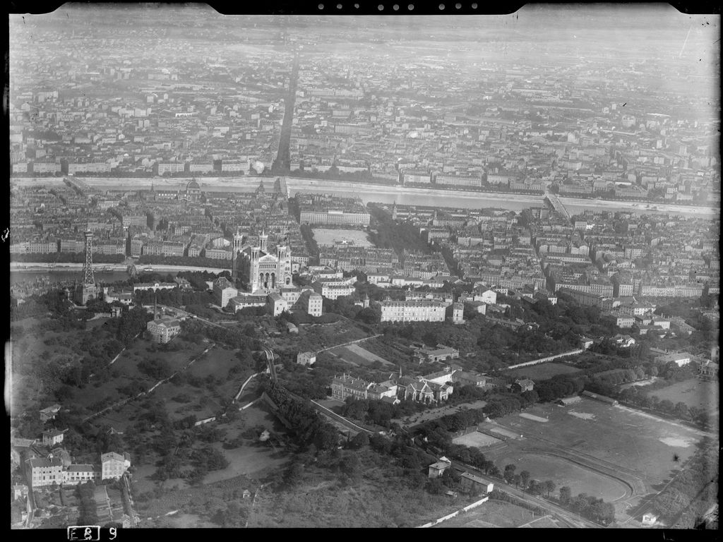 Vue aérienne du Rhône et de la Saône à Lyon (vue vers l'est). Au premier plan, la basilique Notre-Dame de Fourvière achevée en 1884, et le funiculaire Saint-Paul en service de 1900 à 1937