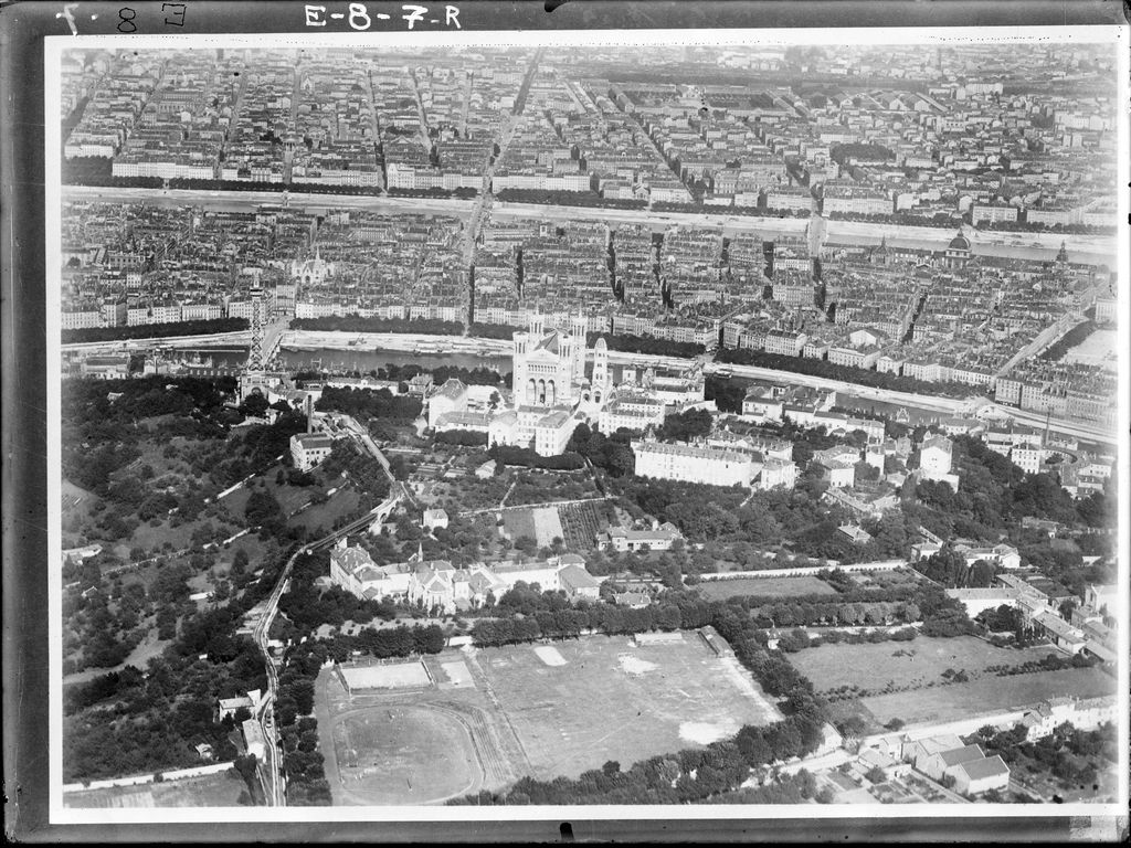 Vue aérienne du Rhône et de la Saône à Lyon (vue vers l'est). Au premier plan, la basilique Notre-Dame de Fourvière achevée en 1884, et le funiculaire Saint-Paul en service de 1900 à 1937