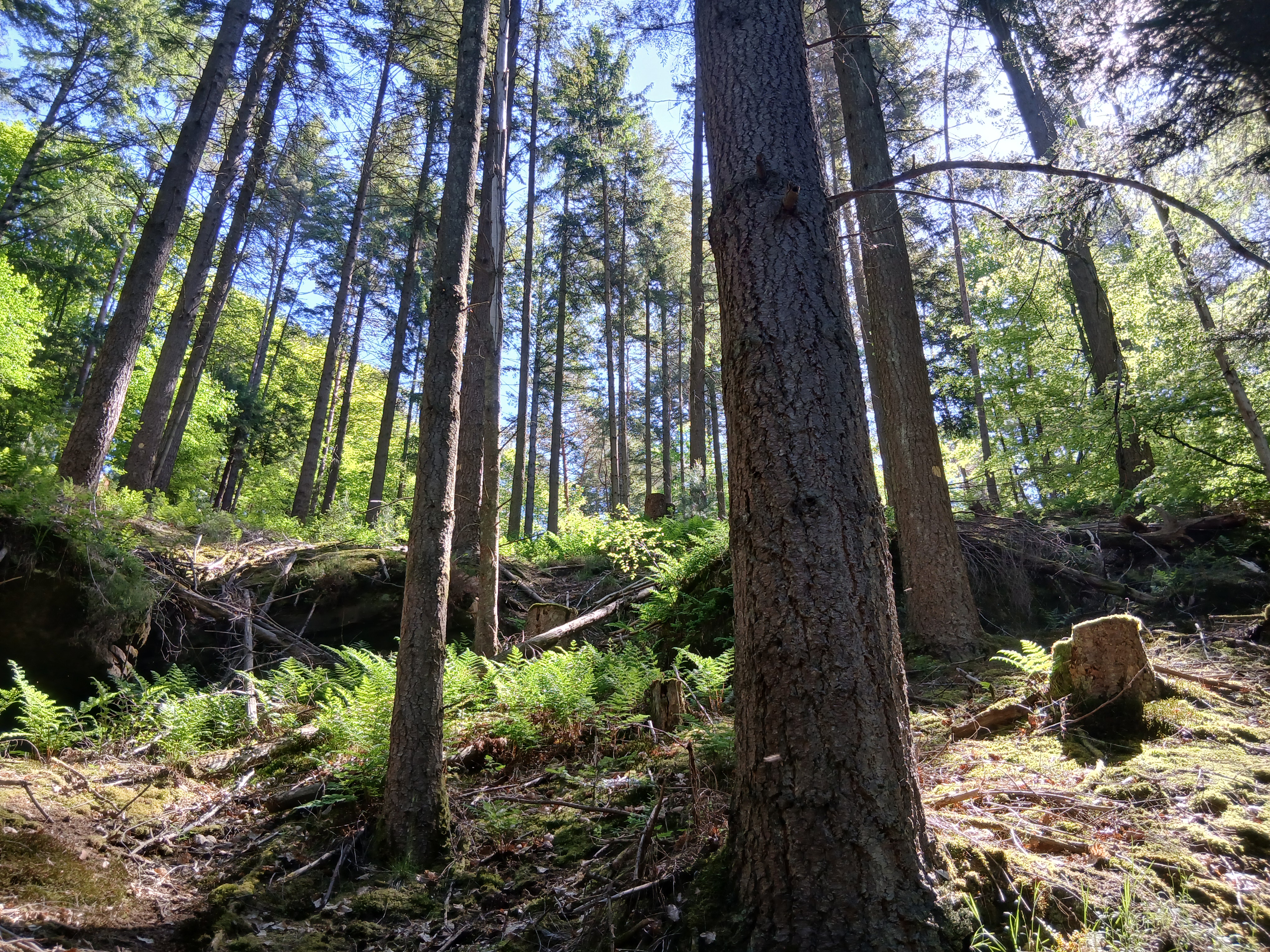Les bois du Pays de Bitche sont presque exclusivement feuillus jusqu'au XIXe siècle. Hêtres et chênes sont exploités au profit des industries locales surtout. A partir de 1850 environ, l'usage du bois et du charbon de bois commencent à décliner et les forestiers introduisent progressivement des résineux dans de nombreux lieux, comme ici en fond de vallon où le milieu frais permet l'épanouissement d'un peuplement mélangé d'épicéas et de douglas.