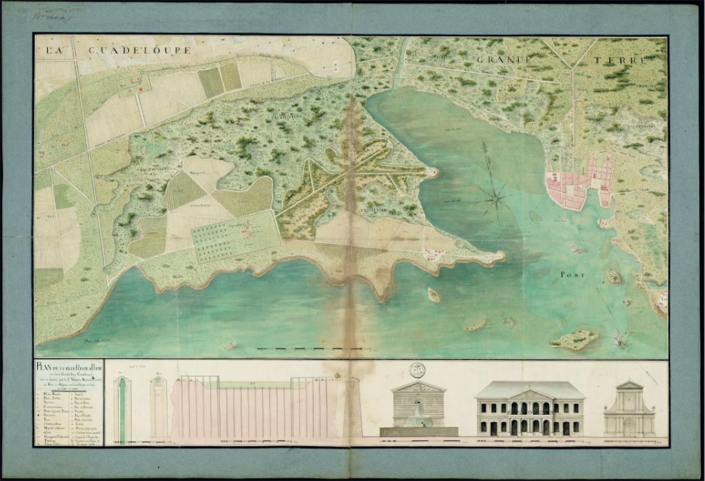 Plan de Pointe-à-Pitre et de Jarry en 1784, avec projet de canal et aqueduc pour amener l'eau douce dans la ville