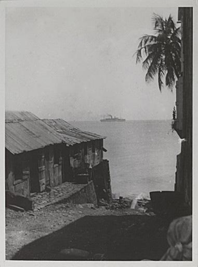 Vue prise depuis le rivage en 1935-1940(cases et accès au rivage), avec le Cuba (CGT, 1923-1944) passant au large