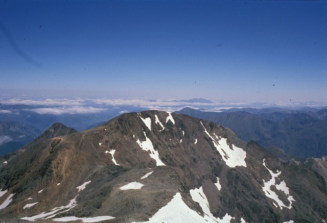 Depuis le Pic d'Estats, vu sur le versant sud du Montcalm. Pointe du Montcalm à gauche,au fond Endron et Massif du St-Barthélémy emmergeant des nuages