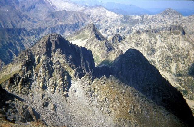 Au fond à gauche, Pic et Cirque de Certescans . Plan intermédiaire : vallée espagnole de la Lladore. Premier plan, Pic de Salibary et crêtes de L'Artigues